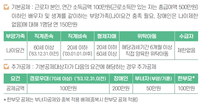 -인적공제: 연소득 100만원 이하인 부양가족에 대해 1인당 150만원씩 적용