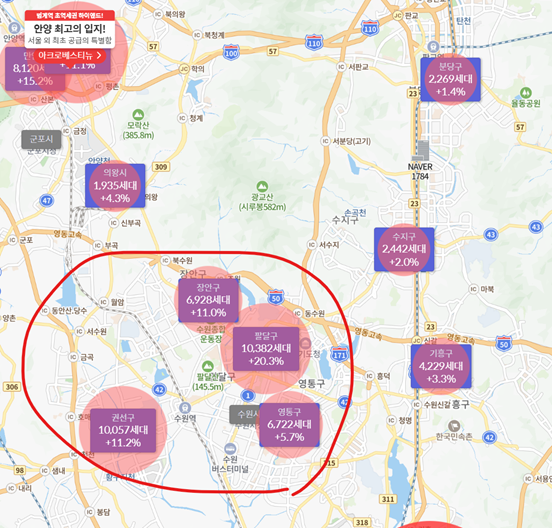 -미분양율(시,구단위 비교) : 수원시는 236세대로, 전체 공급량의 0.6% 수준으로 매우 낮은 편이고, 주변 화성시(238-0.6%) 용인시 (524 – 2.3%)와 비교했을 때 매물들이 충분히 소화된 수준으로 보여짐.