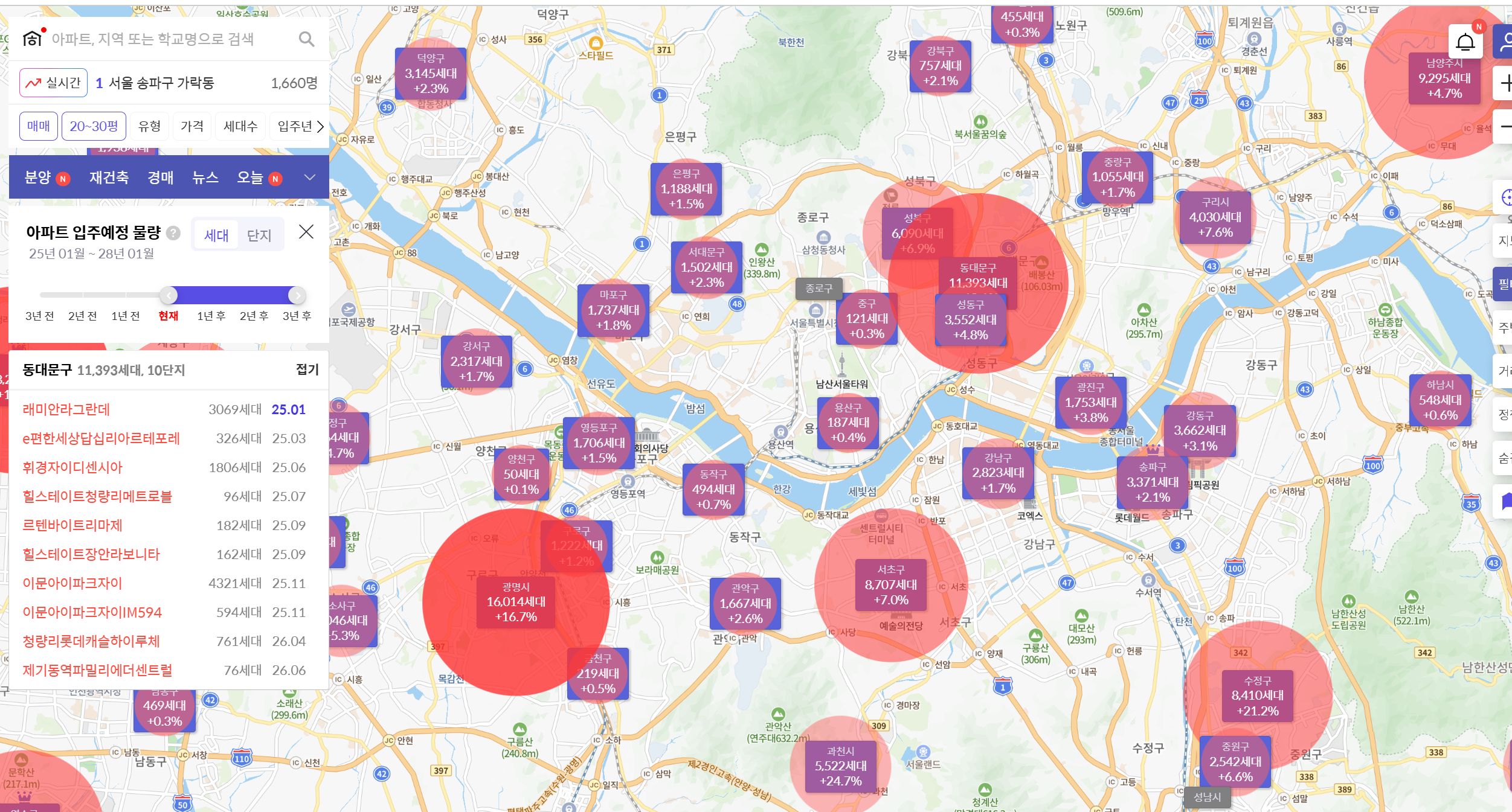 현재부터 앞으로 3년간의 공급량을 필터를 통해 확인해보니, 동대문구의 경우 11,393세대로 12.1% 가 공급예정으로 확인된다. 서울대 25개구 중 1위를 차지한다. 그 뒤로는 서초구(7%), 성북구(6.9%)순으로 공급이 예정되어있다.