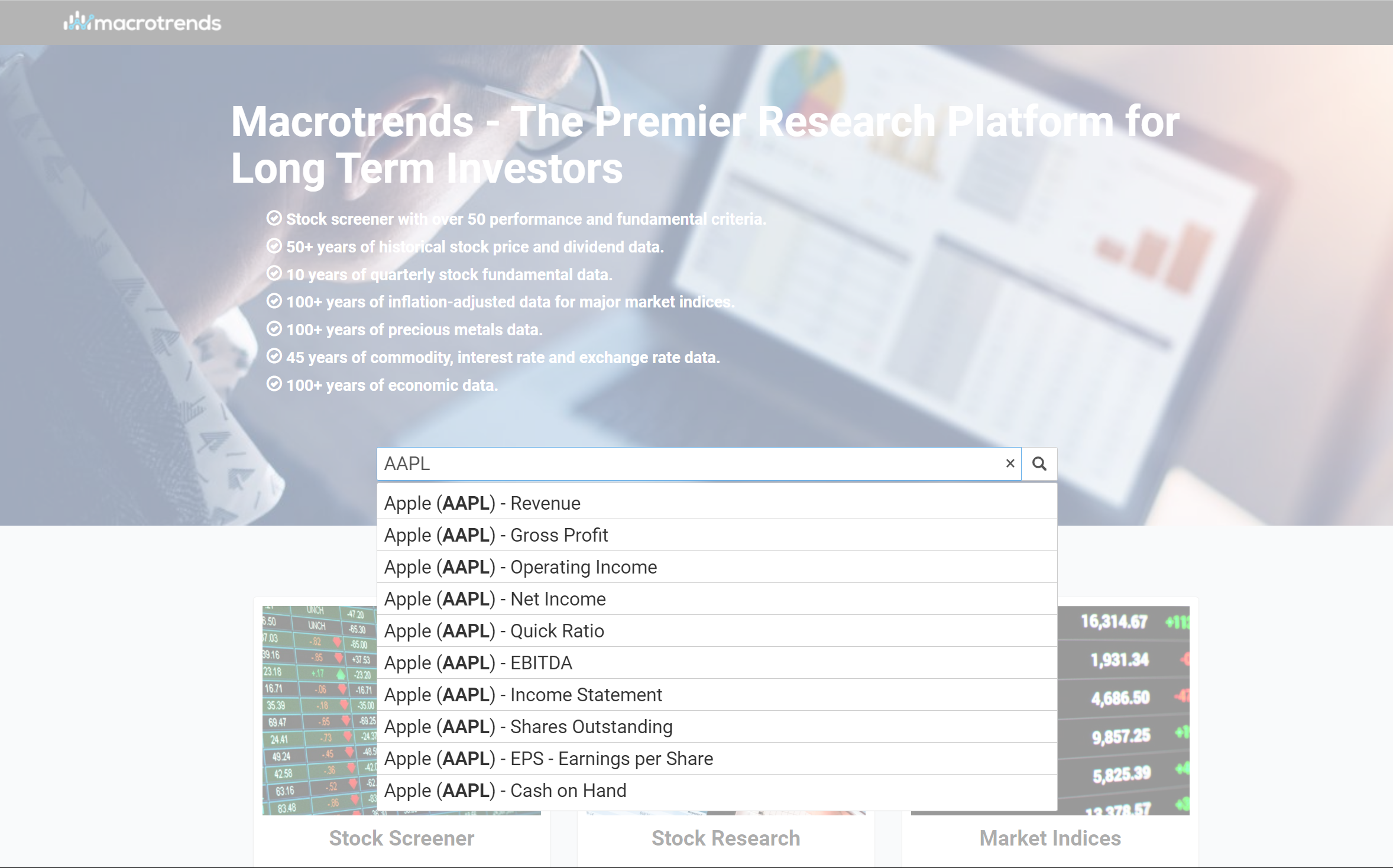 예시는 애플(AAPL) 기준으로 살펴볼 예정이어서 티커인 'AAPL'을 입력해주고, 이때 바로 enter 를 치지 않고 바로 나오는 하위 항목중에 하나를 선택해주어야 합니다. 우선 제일 위에 나오는 매출 (Revenue)를 클릭하여 들어가보도록 하겠습니다.
