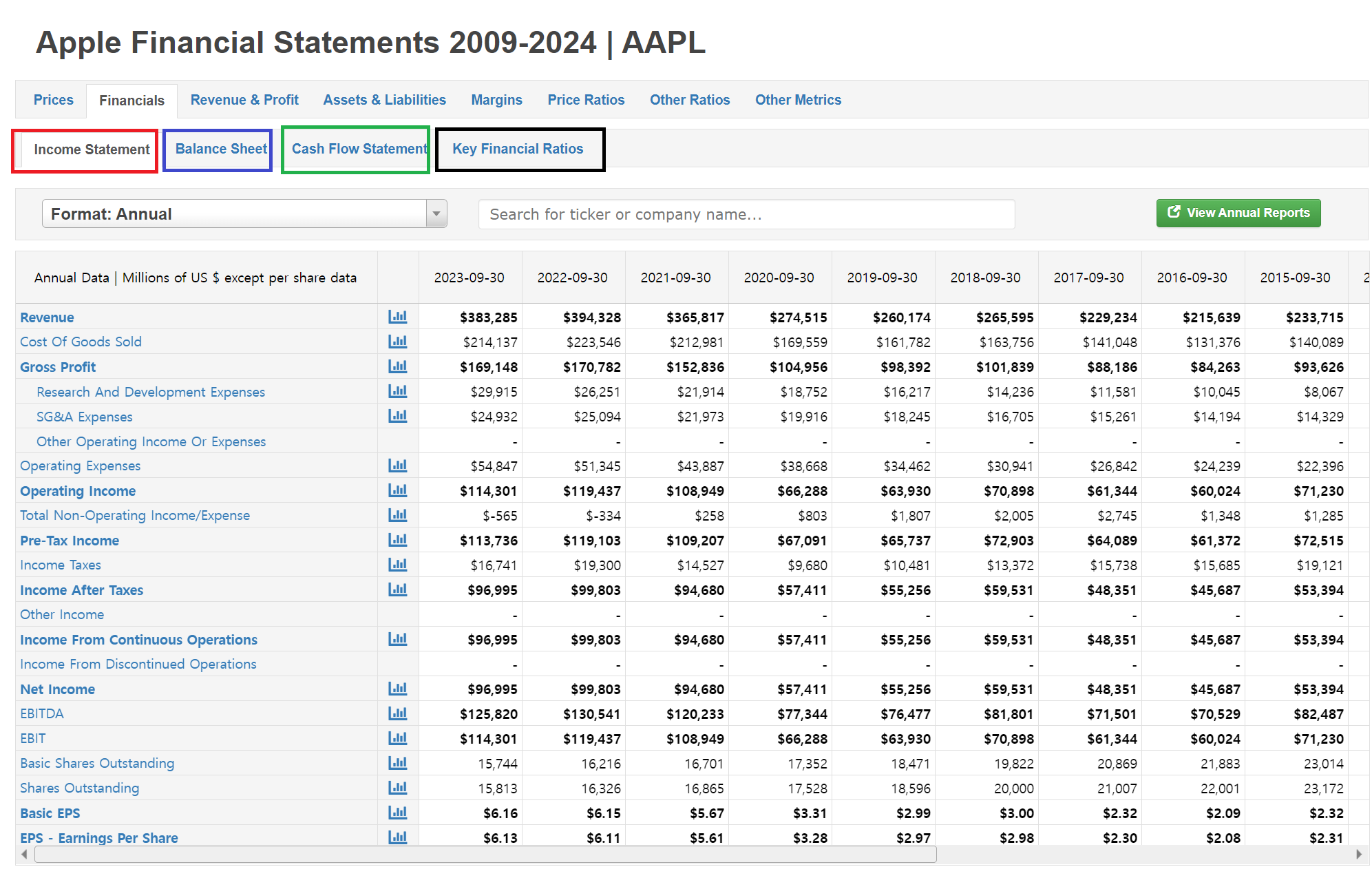 이제 재무재표에서 주로 확인하는 지표에 대해 확인을 해볼 건데요, 먼저 Financial 탭에 들어가면 총 4가지의 카테고리로 나누어져 있는 것을 볼 수 있습니다.