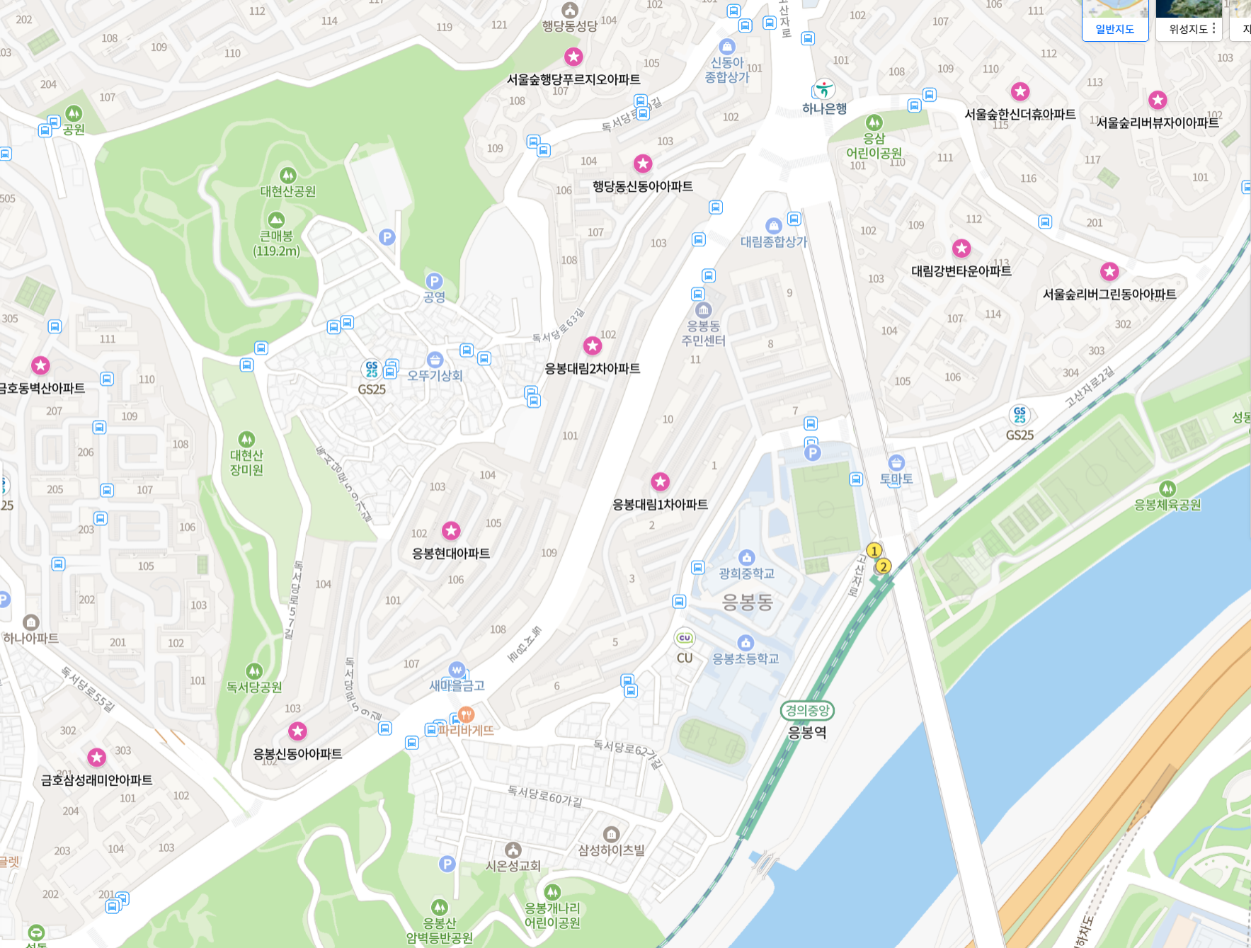 -응봉역과 도보로는 이용하기 애매한 거리. 마을버스는 이용가능