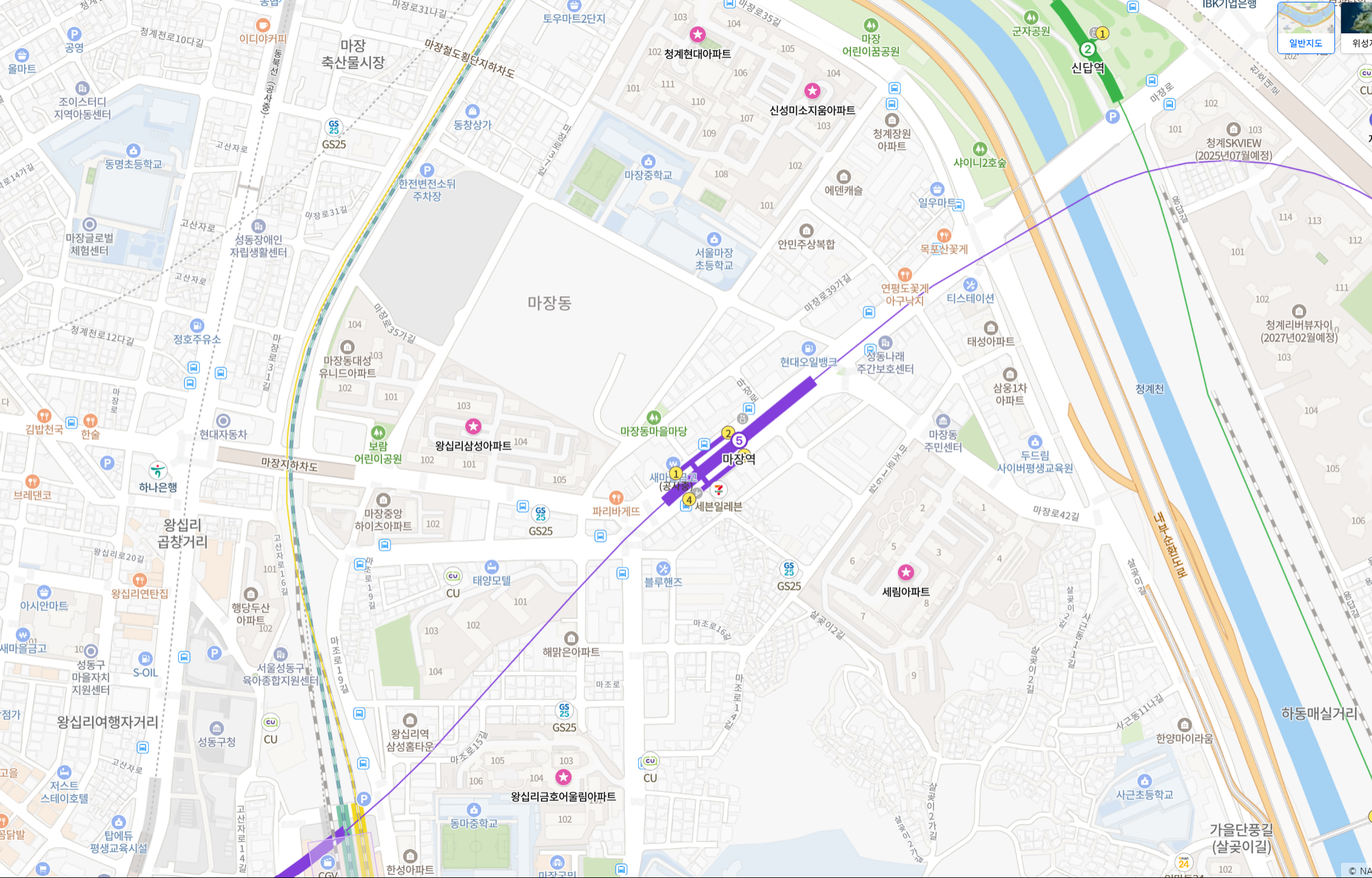 | 마장역 5호선으로, 왕십리 도보 이용 가능한 거리에 있음 | 응봉역 경의중앙선, 서울숲까지 도보로 이동 가능 |