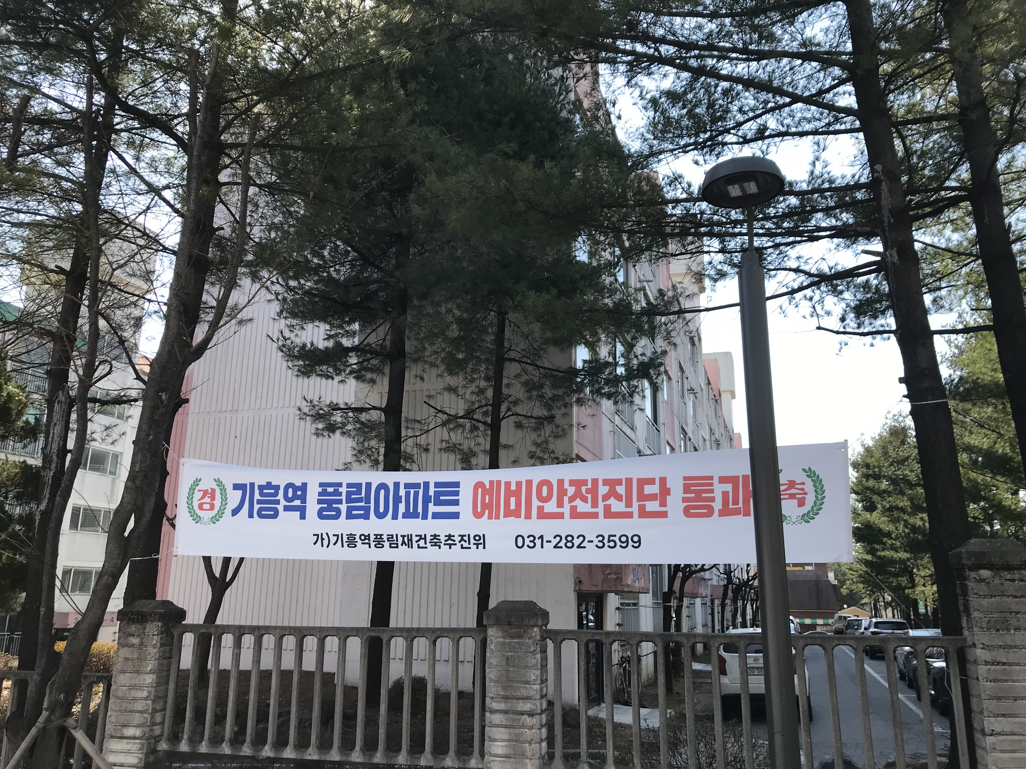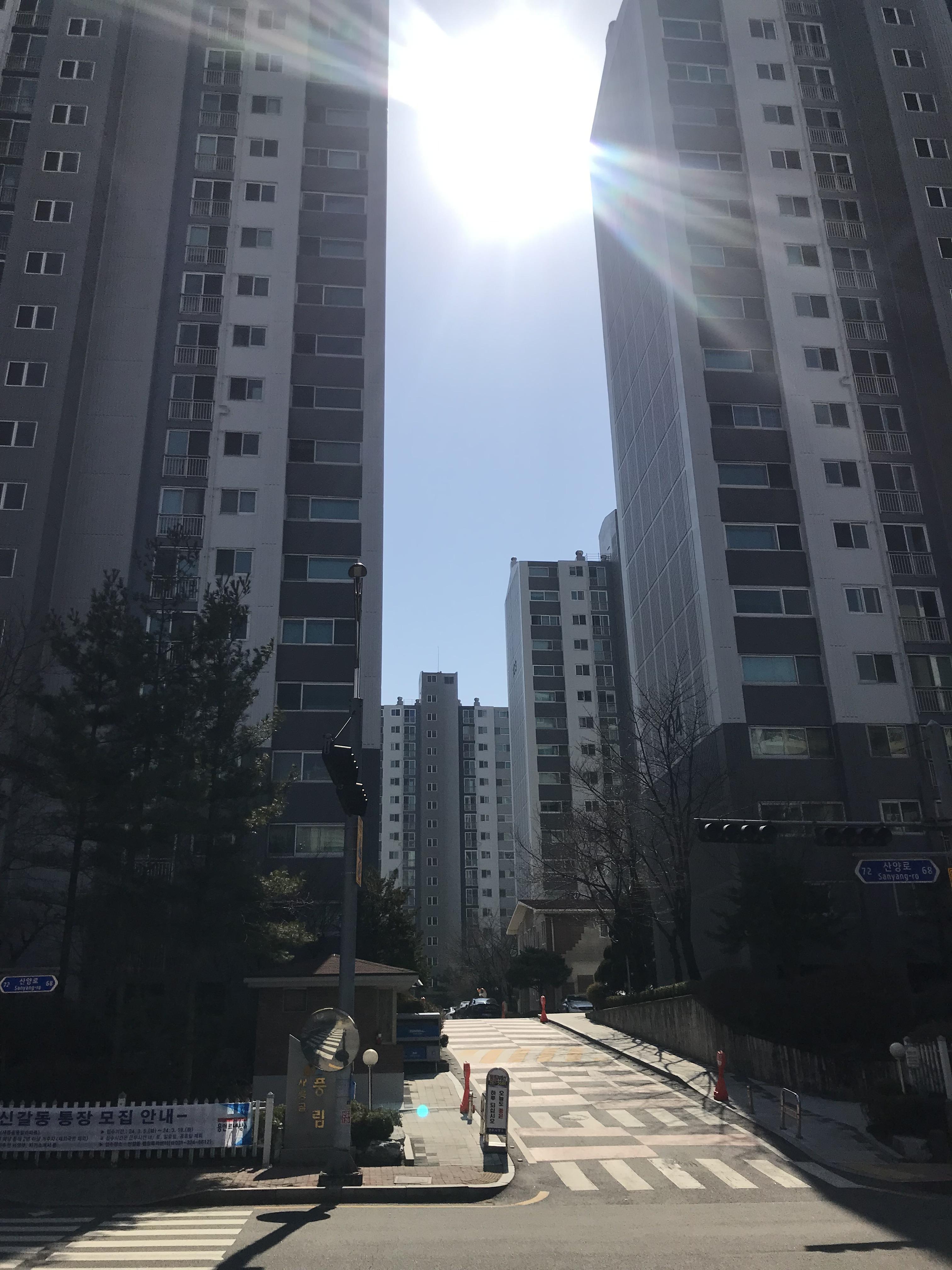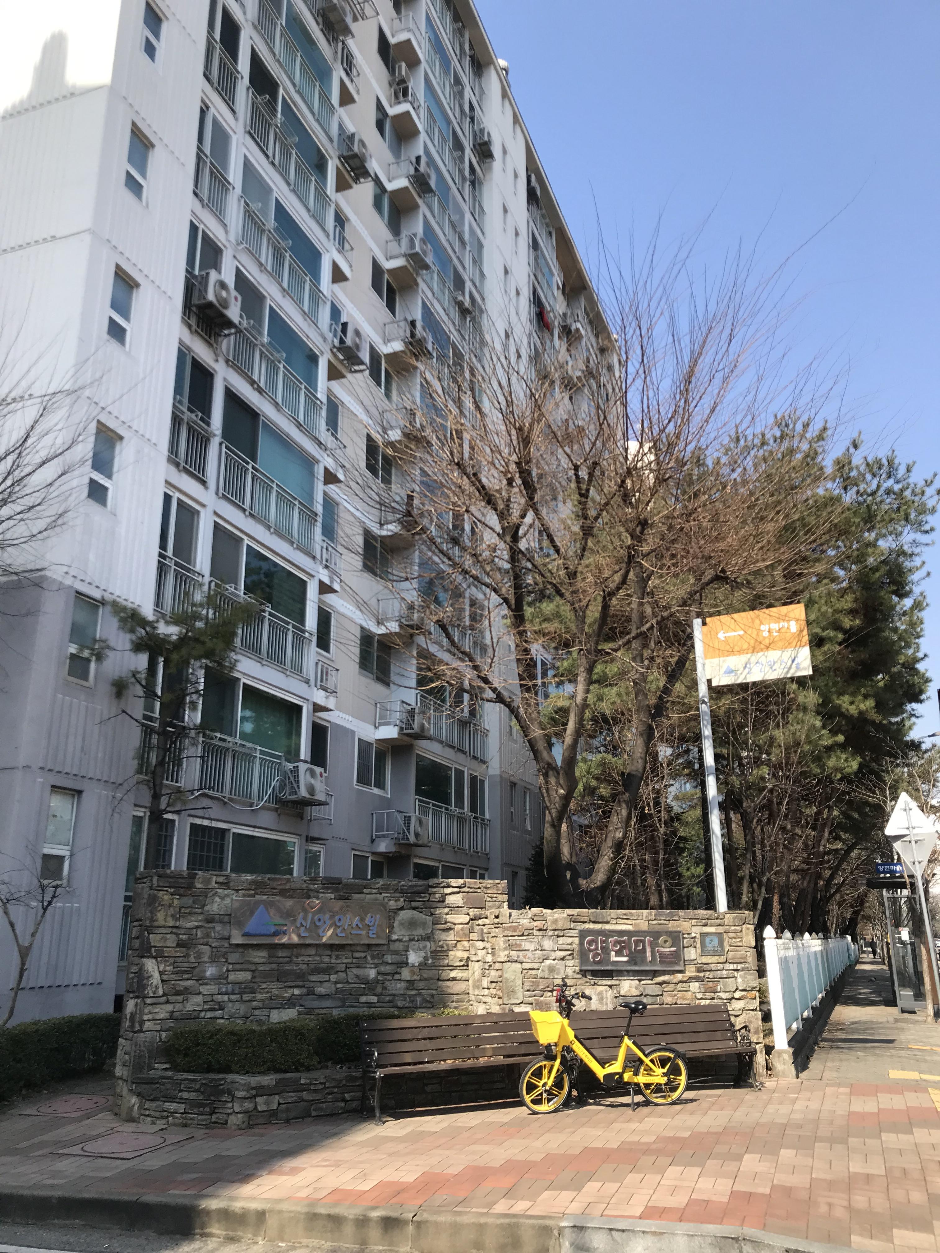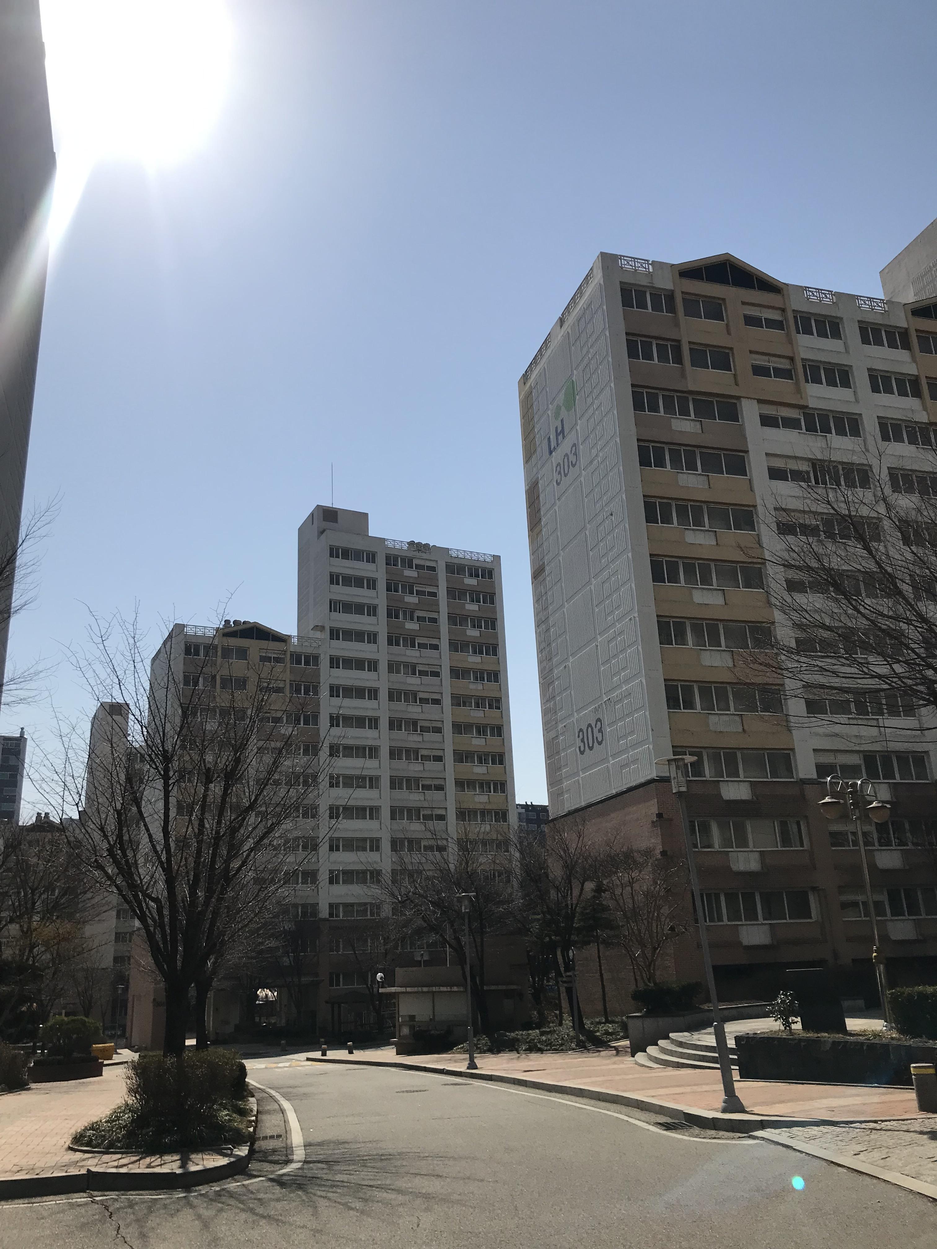 -전반적으로 많이 낡아보이는 외관, 주차난이 심각해 보인다. 구축이라 재건축 진행예정으로 보이며, 현수막을 통해 확인할 수 있었음.