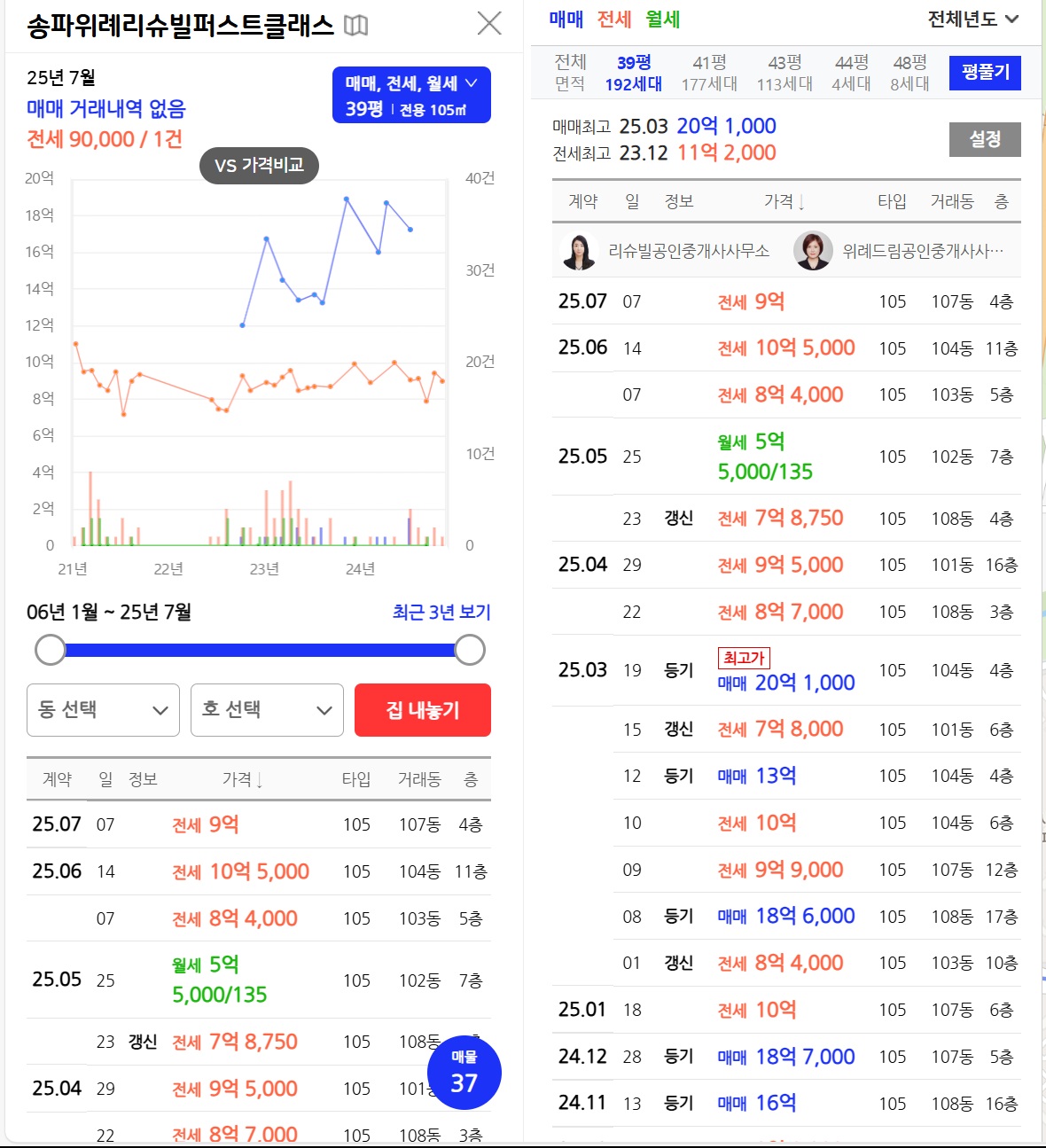 현재 해당 아파트의 매매 시세는 약 18~20억 사이를 형성하고 있는 것으로 보여지며, 전세는 8억정도에 형성되어 있습니다.