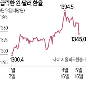 16일 서울 외환시장에서 원·달러 환율은 전일보다 24원10전 하락한 1345원에 거래를 마쳤다. 이는 원화 가치가 상승했음을 의미하며, 지난 3월 26일(1339원50전) 후 약 50일 만에 가장 낮은 수준이다. 일일 낙폭도 지난해 12월 14일 24원50전 하락(1319원90전→1295원40전)한 후 가장 컸다. 지난달 16일 장중 한때 1400원까지 뛰면서 종가가 1394원50전으로 오른 것을 감안하면 한 달 새 50원이나 떨어진 것이다. 전날 휴일에 따른 서울 외환시장 휴장으로 이틀간 하락 요인이 반영됐다는 해석도 나온다.