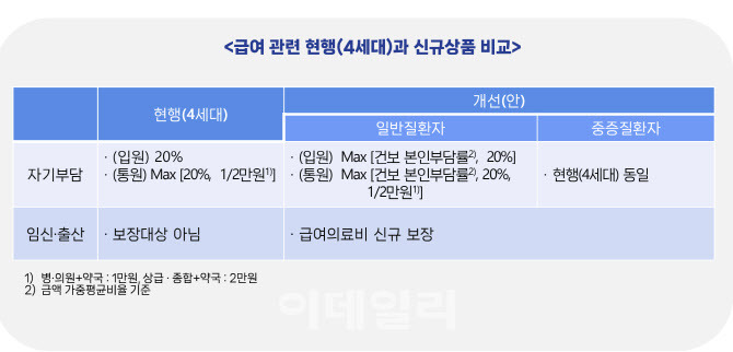 다만 암, 뇌혈관·심장질환, 희귀성난치성질환, 중증화상·외상 등 중증질환자의 경우 본인부담률이 필수 급여항목보다 높게 적용되는 선별급여에도 20%의 최저 자기부담률이 적용되기 때문에 본인부담은 현재와 같은 수준을 유지한다. 또 임신·출산 급여 의료비의 경우 현행 4세대 실손보험은 보장대상이 아니지만 5세대에서는 신규 보장항목으로 들어가게 했다.