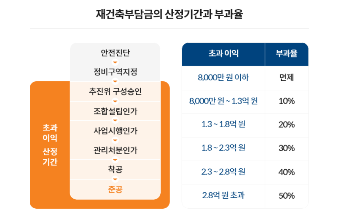 재건축 사업으로 얻는 이익이 조합원 1인당 평균 8천만원을 넘으면, 초과금액에 대해 0-50%의 부담금을 매기는 제도를 의미합니다. 2006년 시행됐으나 주택시장 침체 등의 이유로 2013~2017년 유예됐다가 2018년 1월부터 다시 시행된 바 있습니다. 부담금의 산정기간과 초과 이익에 따른 부과율은 아래와 같습니다.