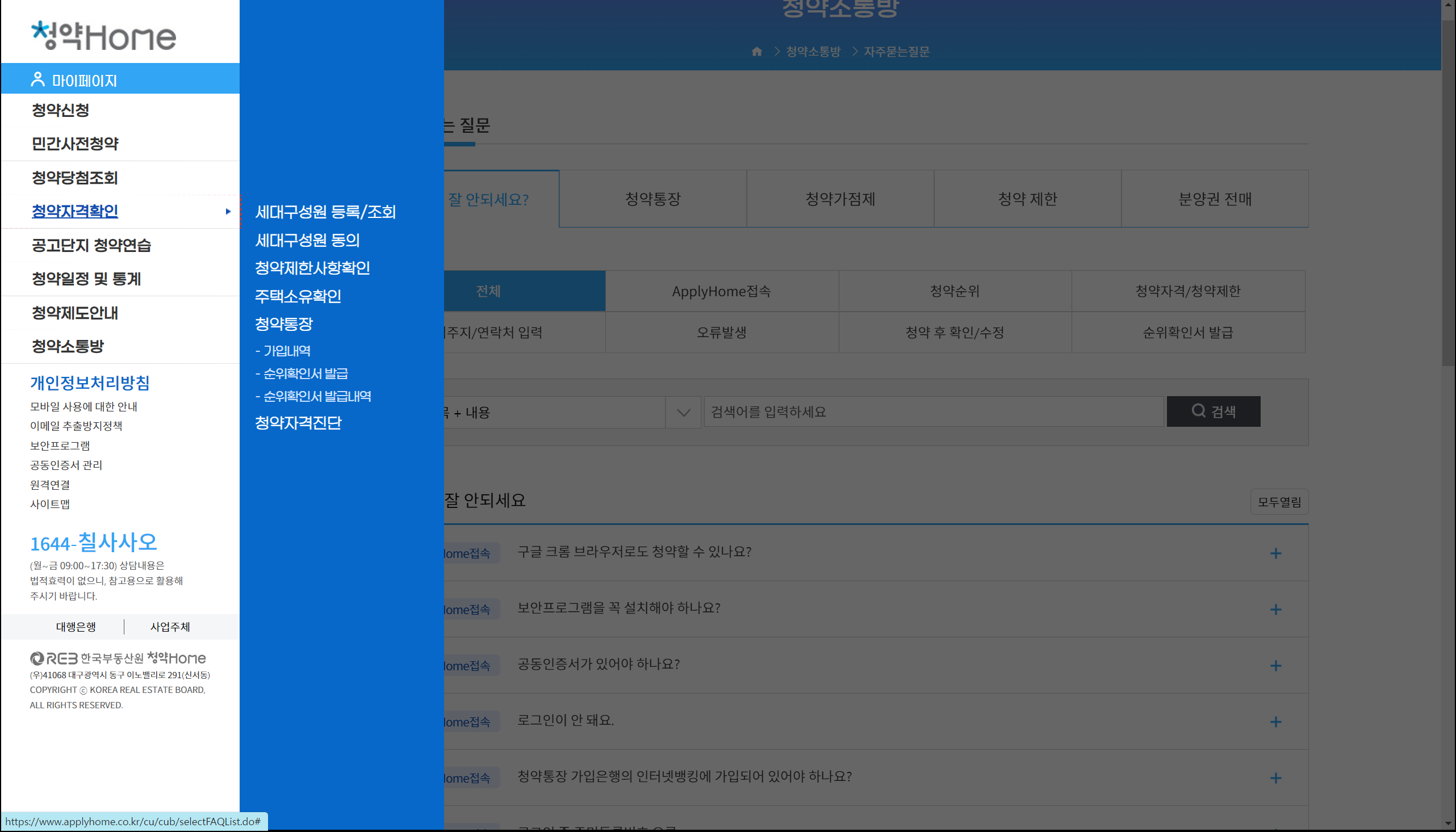 청약홈 접속 후 왼쪽 메뉴에서 '청약자격확인'을 누르면 세대구성원 등록 및 조회부터 청약제한사항확인, 주택소유확인, 청약통장, 청약자격진단 등의 항목을 통해 자신의 청약자격과 가점을 확인할 수 있습니다.