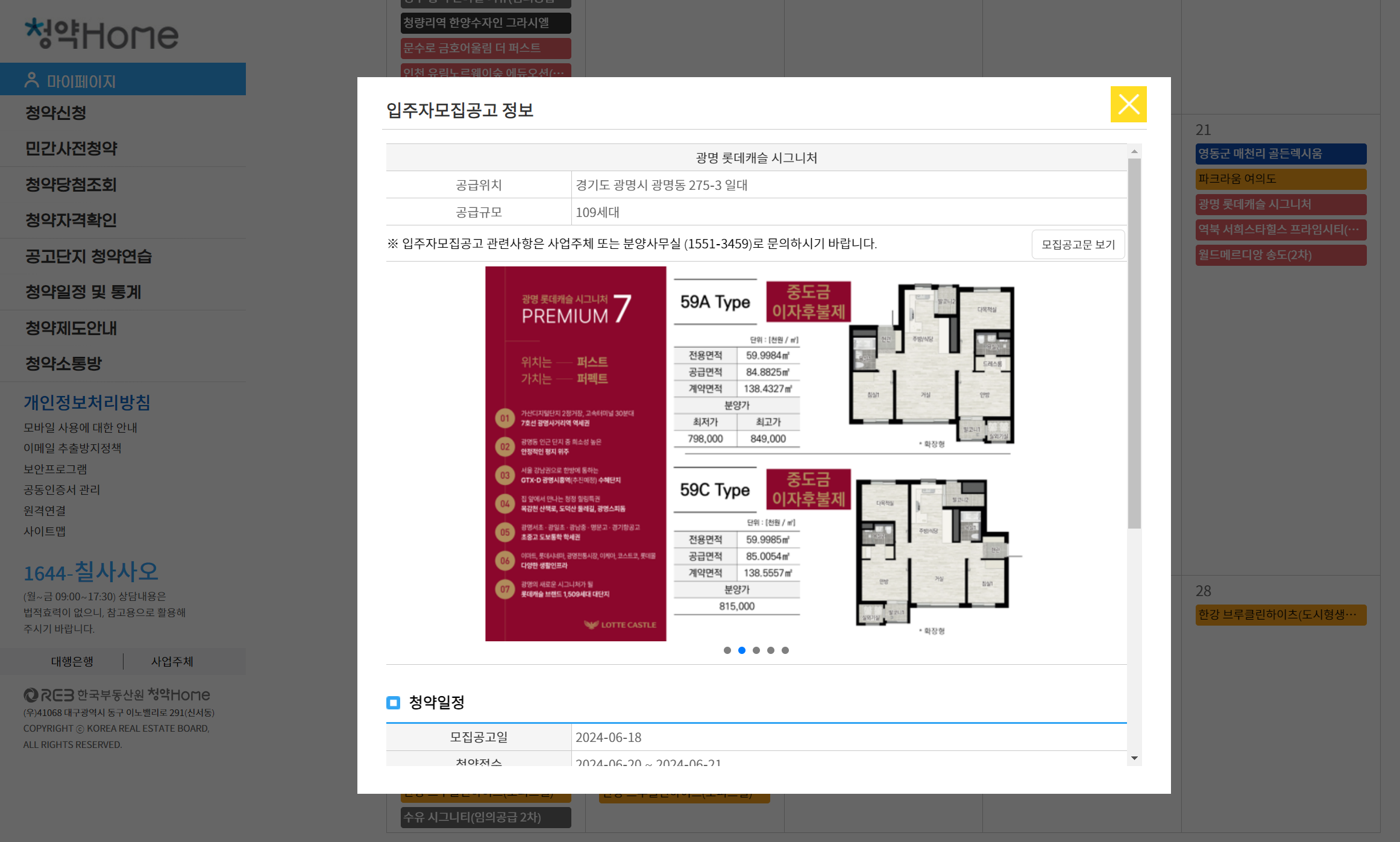 청약홈 홈페이지 => 청약 일정 및 통계 => 청약캘린더 에서 관심 있는 매물의 일정을 클릭합니다. 이번 게시물에서는 20일부터 접수예정인 '광명 롯데캐슬 시그니처' 기준으로 확인해보록 하겠습니다.