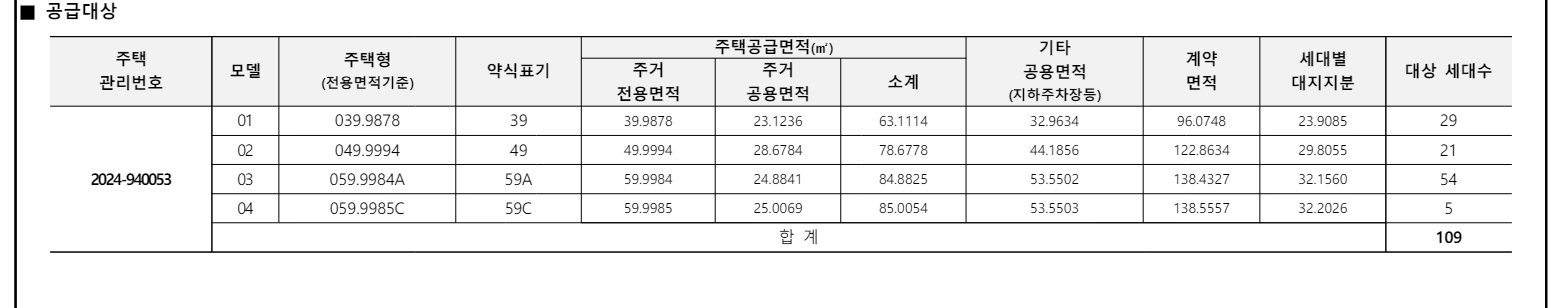 해당 부분을 보면 총 몇세대를 분양하는지, 평형 당 몇세대를 분양하는지를 확인할 수 있고, 분양예정 세대수에 따라 경쟁률을 대략적으로 예측해볼 수 있습니다.