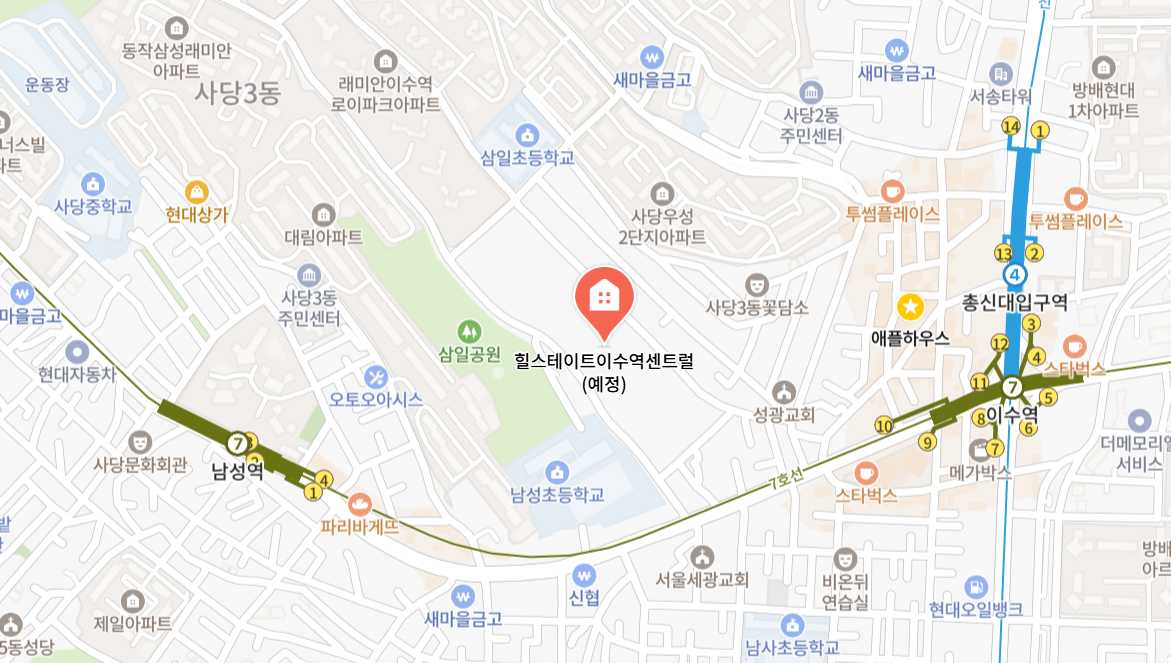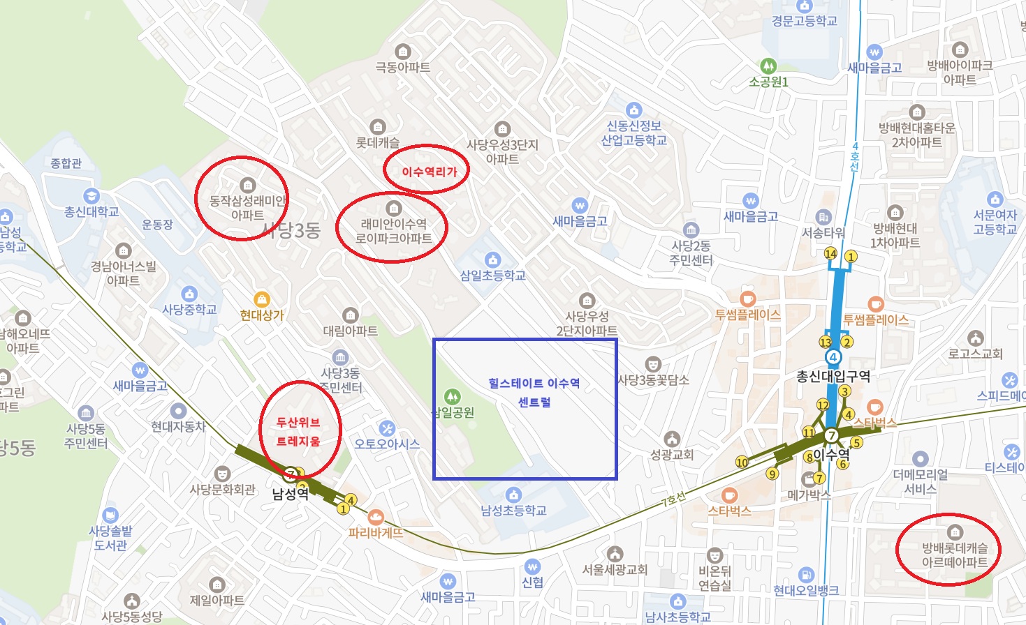 위치로 보면, 7호선 남성역과 이수역 사이에 있지만 이수역 역세권으로 볼 수 있는 위치로 보여집니다.