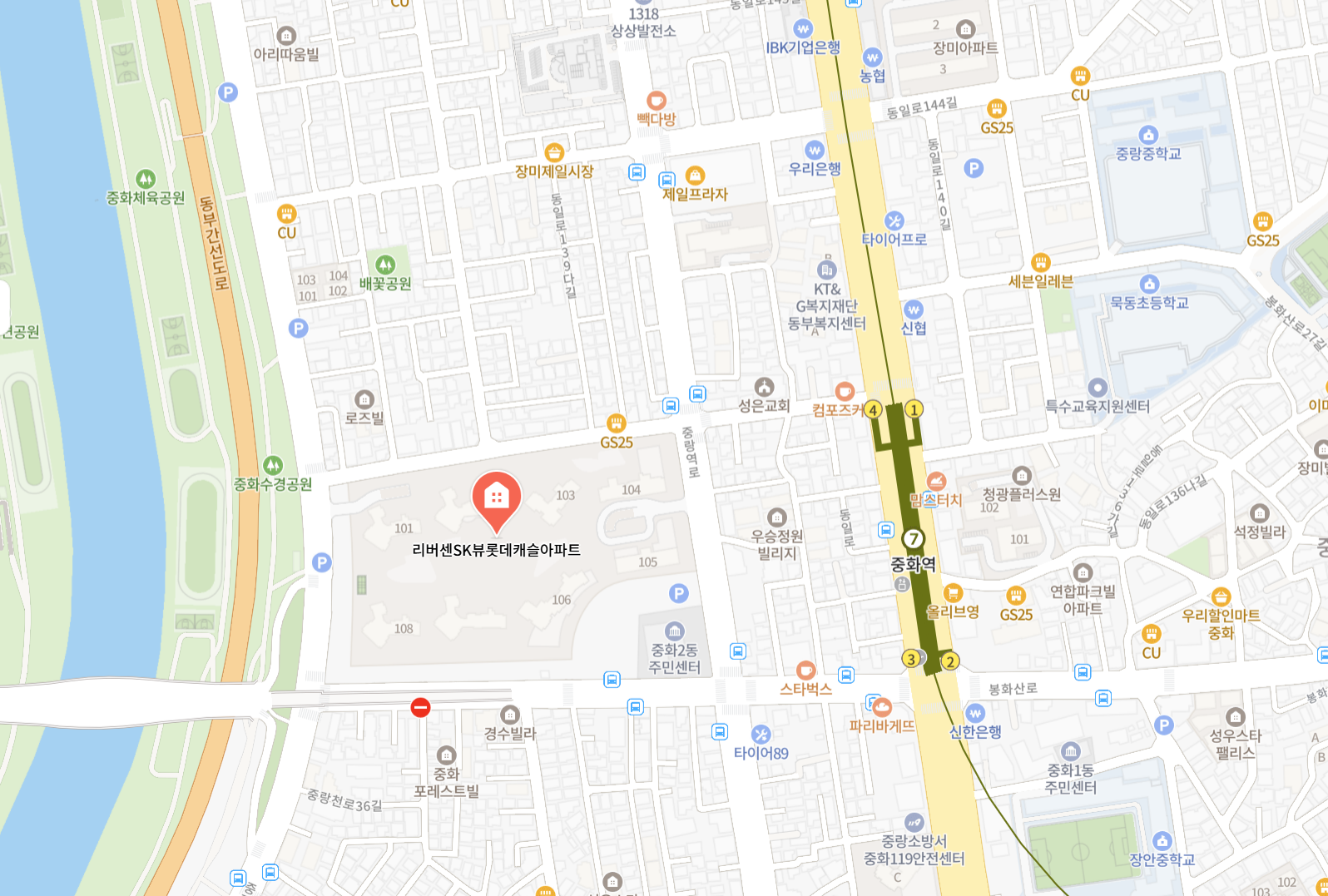 특별공급, 1순위, 2순위 접수가 6월 2일부터 5일 까지 진행되고 있습니다. 위치는 7호선 중화역과 매우 가깝습니다만 주변이 아파트 밀집지역은 아니고, 빌라가 많은 것으로 보입니다. 이 아파트가 중화1재정비촉진구역주택재개발정비사업으로 지어진 아파트이기 때문에, 주변도 같이 재개발이 이루어질 가능성이 있어보이지만 추가 조사가 필요할 것 같습니다.