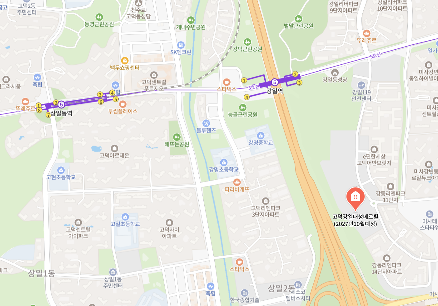 특별공급, 1순위, 2순위 접수가 6월 2일부터 5일 까지 진행되고 있습니다. 위치는 강일역 역세권이지만 주변 학교는 조금 거리가 있는 것으로 보입니다.