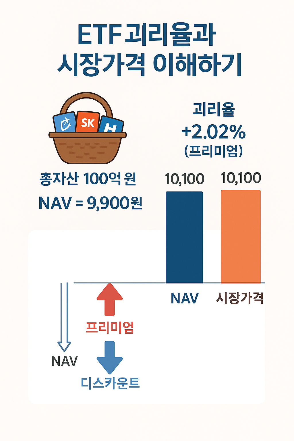 • 즉, ETF는 그냥 주식이 아니라 "자산 바구니"니까, 그 바구니 속 실질 가치를 대표하는 게 바로 NAV라고 할 수 있씁니다.