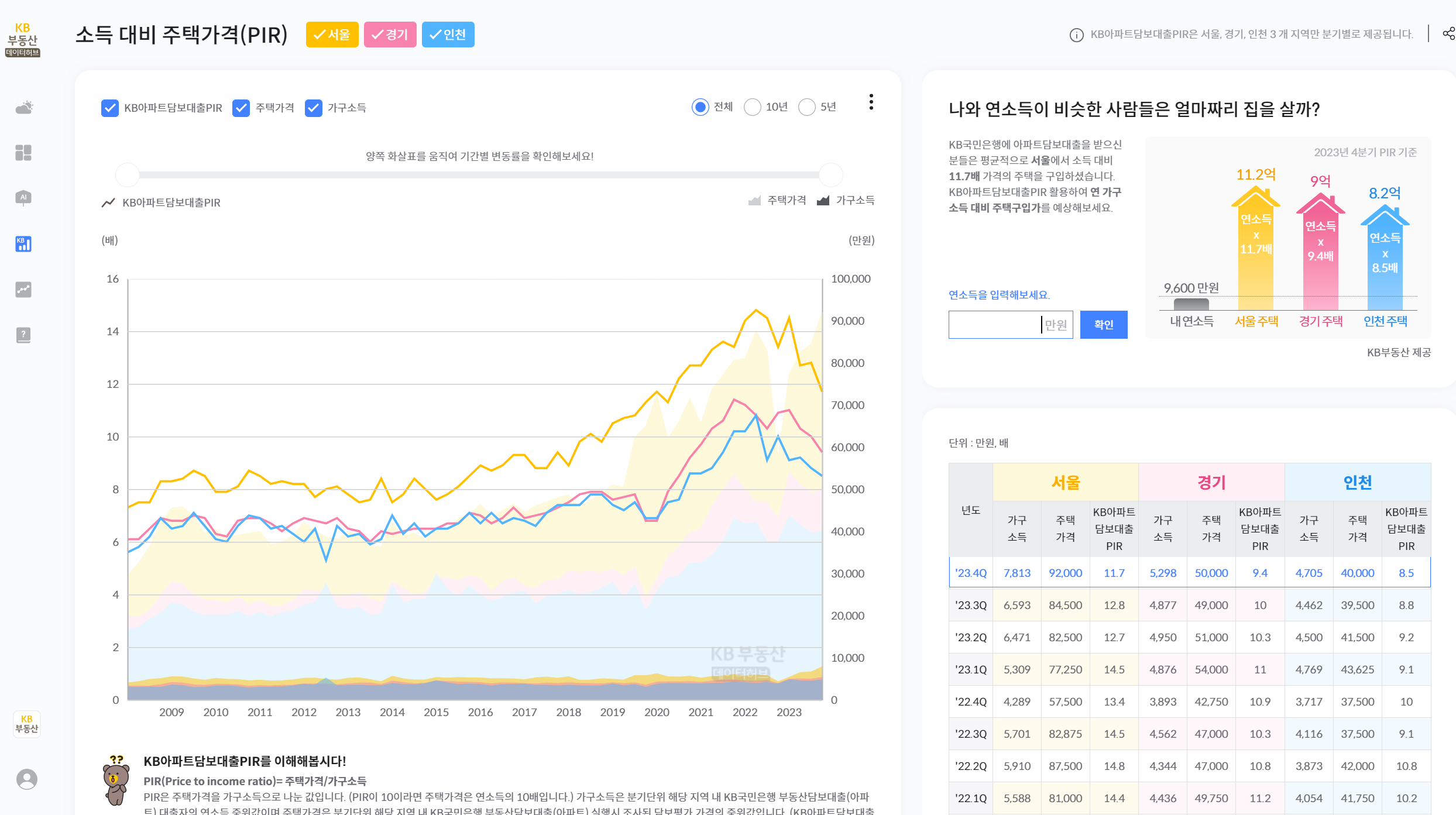 **가구소득은 분기단위 해당 지역 내 KB국민은행 부동산담보대출(아파트) 대출자의 연소득 중위값이며 주택가격은 분기단위 해당 지역 내 KB국민은행 부동산담보대출(아파트) 실행시 조사된 담보평가 가격의 중위값입니다. (KB아파트담보대출PIR은 실제 KB국민은행의 대출거래 정보로 작성된 지수로 기존 당행에서 발표중인 PIR과는 차이가 있습니다.)