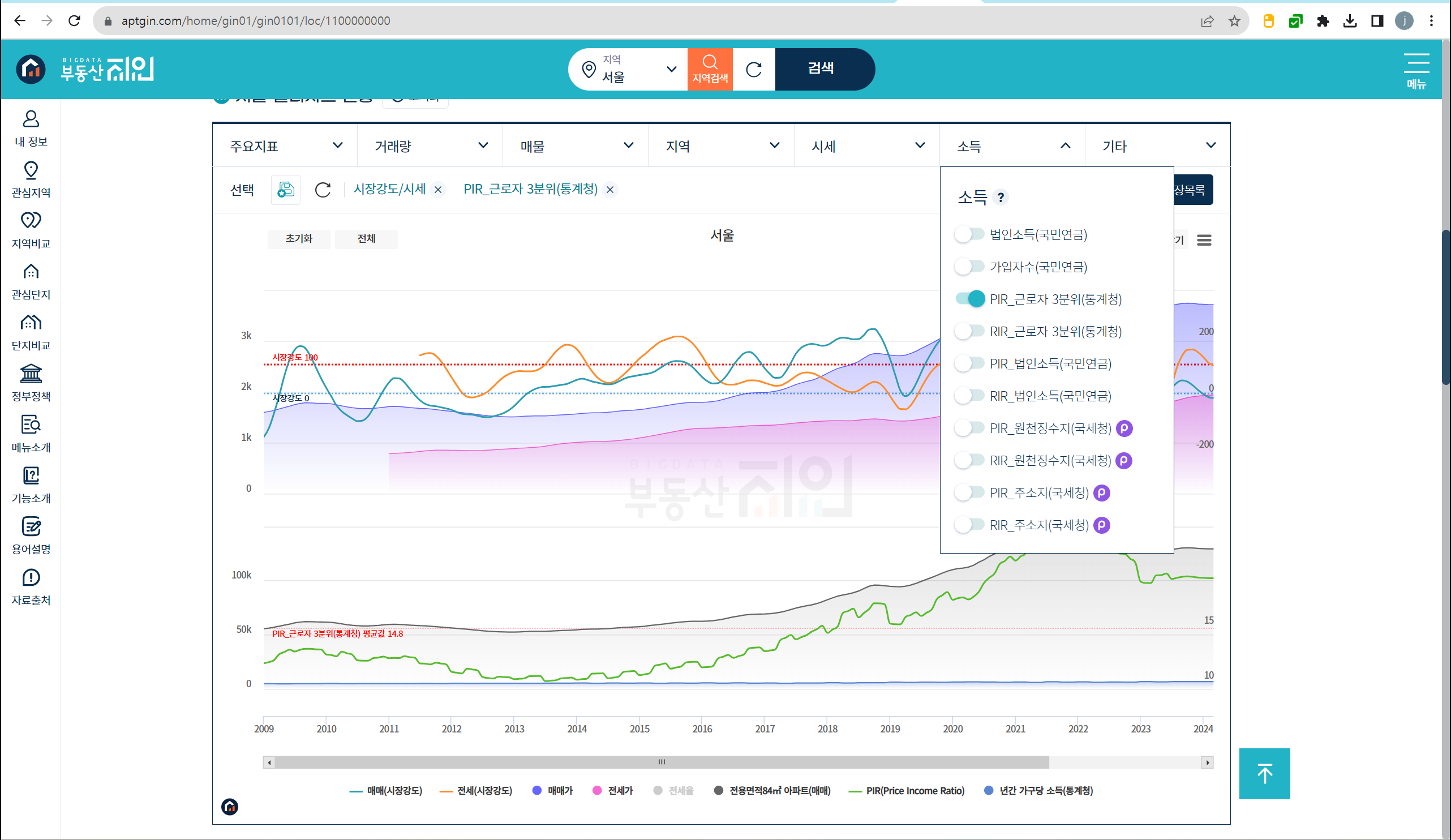지역분석=> 지역통계=> 원하는 지역 선택 => 하단 차트에서 '소득' 선택 후 PIR 필터를 적용하여 동향을 살펴볼 수 있습니다. (월별통계)